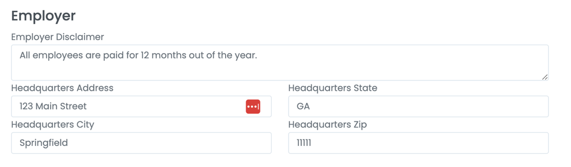 • The Employer Disclaimer can be preset in the account Settings. The address can be updated in the Company Profile