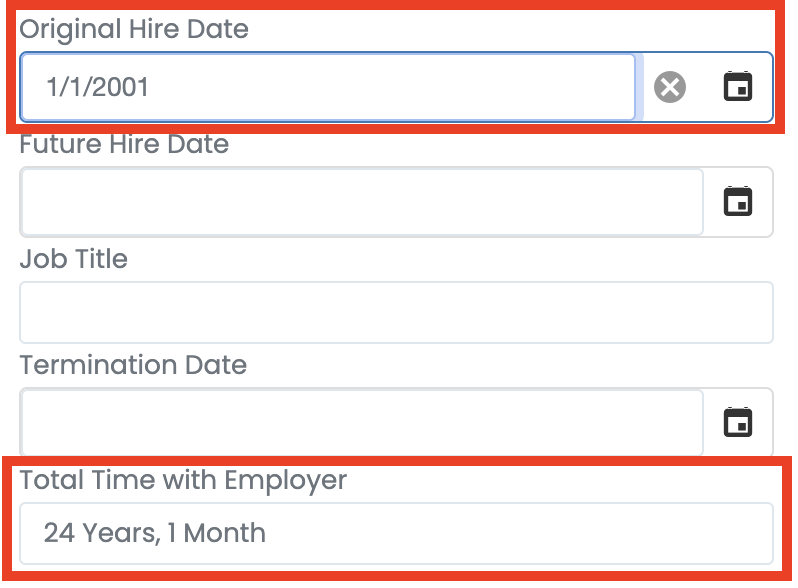 • The system calculates and enters the Total Time with Employer based on the Original Hire Date.
