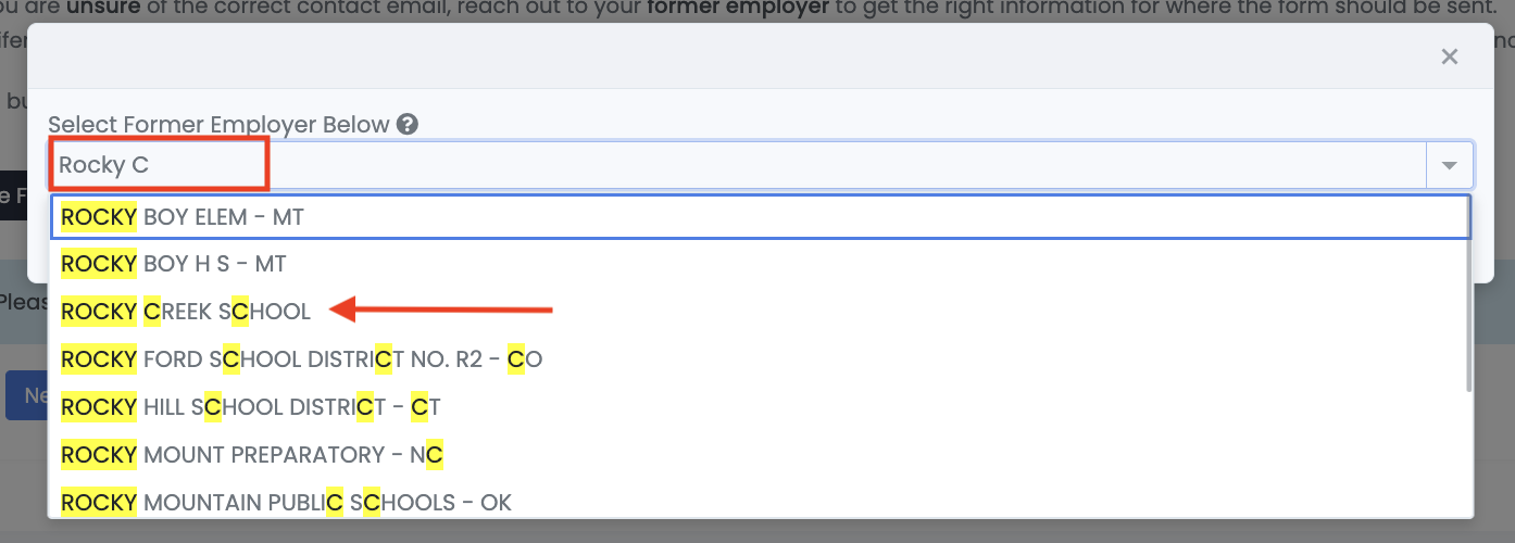 • Si no puede localizar a su ex empleador o no es un distrito escolar, escriba y haga clic en "Ex empleador no encontrado"
