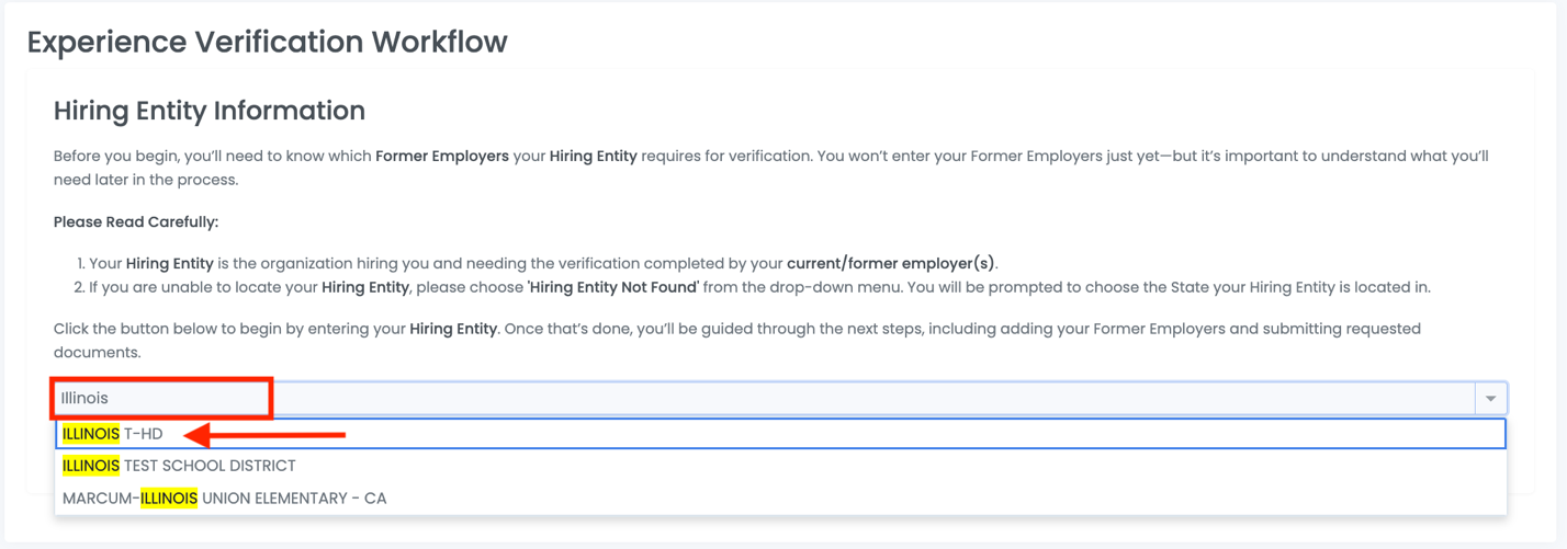 • Esta es la entidad contratante a la que desea que se entreguen sus verificaciones de experiencia una vez finalizadas.Click ‘Save Hiring Entity’